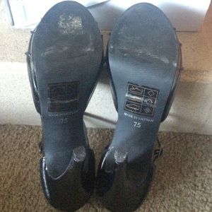 Black strappy heels with flower in front, gently used, 4 1/2 inch heels.