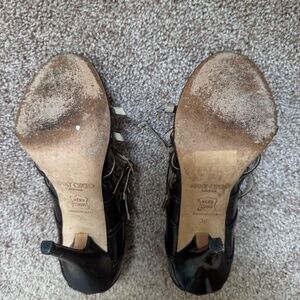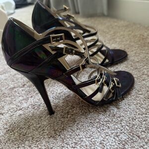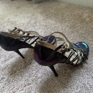 “Oil slick” sandals that it looks iridescent with gold tone buckles by Jimmy Choo.