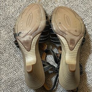 These were purchased in England. They are comfy and cute with a low 2 inch heel. There is cream colored sticking on all straps. They are in good condition overall. Note the photos of the bed on the left sandal and slight scuffing on toe of same sandal. Very little wear. Fit like a US 6.