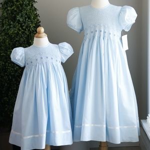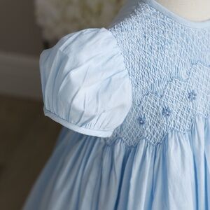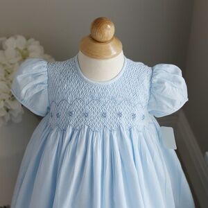 This Strasburg 18 month baby blue dress is adorable!! Traditional and Classy in style, this 100% cotton lawn float dress has beautiful hand smocking across the entire bodice in a lovely lattice design in white threading. Within the smocking is hand embroidered blue flowers with pearl centers. The sleeves and neckline are both trimmed in matching blue piping. The dress had short, puffed, classic sleeves. Upper button back with a matching tie-back sash. The skirt is fully lined and has a satin ribbon band above the hem. Worn for Spring portraits and professionally cleaned. Looks Brand New. Excellent Condition-Gorgeous!! Great Find-Dress hasn't been produced in years!!