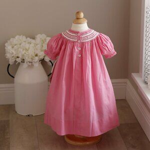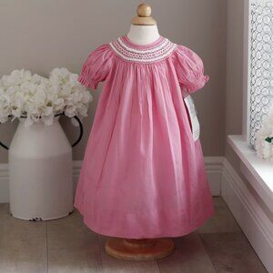 This Strasburg Smocked Pink Bishop dress in Size 12 Months is adorable. A limited edition Raspberry Pink color that is no longer in production makes it a RARE FIND in NEW CONDITION !! Beautiful hand smocked neckline with white satin ribbon woven throughout the smocking. Sweet little hand embroidered rosettes are the finishing touch! Beautiful hand made Strasburg quality! New with Tags!