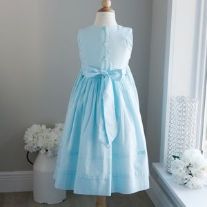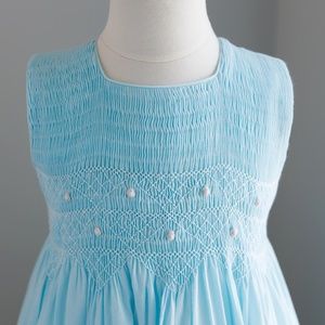 This Aqua Blue Smocked Strasburg Sleeveless Dress is Gorgeous. A pristine, crisp cotton dress with a hand smocked bodice that is detailed with pink embroidered accents. Sweet pink embroidered flowers have white centers. matching Aqua blue piping trim at neckline and arm openings. French seams (high-end quality) Tea length hem with beautiful French tucks adorning the skirt. Upper button back and tie-back sash. This was a Limited Edition color and a rare find (especially in this condition).Beautiful Strasburg quality!!! Perfect immaculate Condition- Still Looks New!