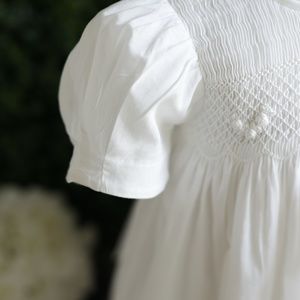 This Strasburg crisp white Hand Smocked size 24 Month Dress is Angelic! One of Strasburg's original designs. All white cotton lawn with a hand-smocked bodice which has French knot flowers with seed pearl centers and white satin ribbon leaves. The details are exquisite! Pleated sleeves, tie-back sash. Button back closure. Two white satin ribbons adorn the fully lined skirt. Perfect for a little Flower Girl or other Special Occasion. Matching NB-3 month and a 24 month dress available also (see last image). Perfect condition!! Gorgeous, Rare find in this condition!! NEW WITH TAGS!!