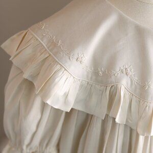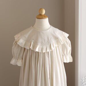This UNIQUE Gorgeous Heirloom Strasburg Dress is a Gem! The dress is done in Ecru which was a Limited Edition color when the Original company was named Strasburg Lace. The tea length float dress made of cotton lawn has beautiful detailing. The detail on this Strasburg Dress has intricate embroidery and piping trim around the collar. The large round collar is trimmed in a 2 inch ivory satin ruffle and has ivory/ecru hand embroidered floral fines that wrap the entire span of the collar, front to back. The puff sleeves have a matching satin ruffle trim and are elbow length. Two bands of matching satin ribbon adorn the skirt. The Ivory trim on the dress creates an amazing tone-on-tone effect. Upper button back. Comes with a separate complimentary slip (did not come with dress). Generous sizing allows room for growth. Great for special occasions, portraits, church or weddings. Would be great for a flower girl!! One of Strasburg's most Classic Designs, but in Limited Edition Color!! Beautiful and Classy!!!! Worn once for wedding- Wonderful, Like New Condition! UNIQUE!