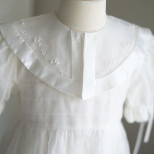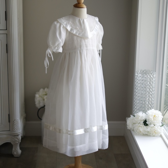 This RARE ORIGINAL Strasburg Elegant Heirloom dress is stunning! Made of Cotton and Organza, the color is a lovely Ivory (lighter than cream, but not bright white)satin trim. One of Strasburg's most elegant designs, this dress has beautiful detailing. The Hand embroidered collar is trimmed with a matching satin edge. The bodice has layers of soft French tucks that wrap all the way around the back of the dress. The hem has a matching satin trim. The puff sleeves gather with a satin ribbon that ties into a bow. The back has an upper button closure. Fully lined. Beautiful and angelic!! Beautiful-New With Tags!! Stunning!!