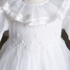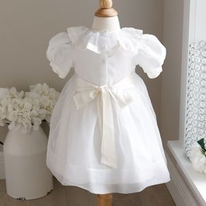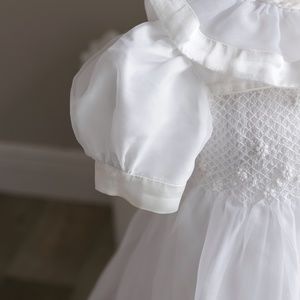 This Strasburg Heirloom Dress is a Treasure! It is one of the "Strasburg Lace" original designs before the company changed names to just "Strasburg". The heirloom dress is done in a white organza with ivory satin trim. The bodice is smocked in a lattice design in white embroidery. Hand embroidered floral detail sits on top of the lattice design. The short puff sleeves have an overlay of organza with a 1 inch ivory satin ribbon band hem. The oversized ruffle collar is Gorgeous!! It is made of a double layer of organza with a 1 inch satin ribbon band hem (matching the sleeves) and a quarter inch satin band trimming the rounded neckline. The entire dress is lined with a white liner. Upper button back closure and a matching ivory satin sash that ties in the back into a bow for the perfect fit. GORGEOUS FLOWER GIRL dress, or other Special Occasion. This little dress is HEAVENLY and a RARE FIND! The sash has slight wear and some wrinkles, but other than that, the dress is Pristine!! Absolutely Beautiful!!