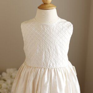 This Strasburg Silk Dress is Gorgeous!! The dress is done is 100% Dupioni Silk in a beautiful Ivory/Cream hue. The bodice is done with vertical pin tucks creating a diamond pattern. That along with the textured silk is just gorgeous. The waist gathers and is bordered with a matching silk piping. The full longer length skirt has a 3 1/4" matching band at the hem mimicking the bodice's Diamond pattern. The back has an upper button closure done in matching silk fabric (a high-end feature). A wide matching ivory sash ties into a bow in the back for the perfect fit, adding another gorgeous feature. The skirt is lined and has a ruffle tier of tulle at the bottom for added volume. Still looks New-Perfect Condition. A stunning dress for a Flower Girl or a recital. Classy and Timeless style along with Strasburg quality.