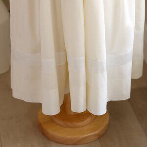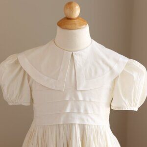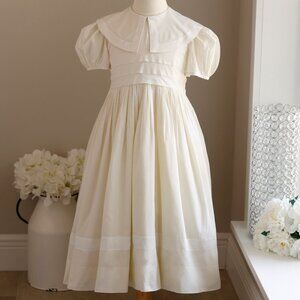 This Strasburg Ivory Heirloom Collection Dress is a WONDERFUL FIND!!! The dress is an Original "Strasburg Lace" dress (The Original Company Name). The Vintage Heirloom Ivory/Ecru Dress is done in a 100% Fine Cotton Lawn. The Deep Ivory/Ecru hue is neutral and a pleasant change from typical Ivory which tends to have yellow undertones. The oversized matching collar has an ivory satin trim. The bodice has 3 French tucks that join the gathers of the skirt. The short puff sleeves have a matching piping band. The gathered skirt has a matching ivory satin ribbon band near the bottom hem. A matching tie-back sash makes for a perfect fit. The skirt has a built in matching slip. Dress is fully lined except for the sleeves. An Heirloom Treasure!! Perfectly preserved Strasburg Heirloom- Perfect Condition! Gorgeous Flower Girl Dress done in 100% Cotton!!