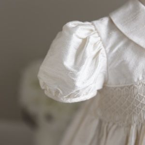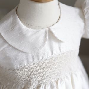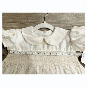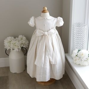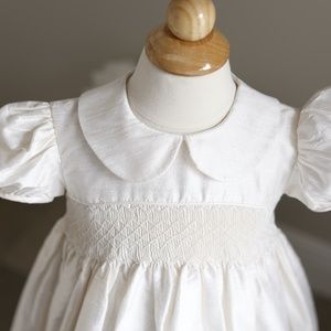 This 100% Ivory Silk Dress by Strasburg is Stunning! The dress is done in a beautiful Dupioni Silk. The Peter Pan collar add sophistication and elegance.The short puff sleeves gather and have a matching piping trim. The bodice is gorgeous! Beautiful smocking with a lattice design embroidery with Chevron borders. The top of the smocking has a matching ivory silk piping, giving a finished, tailored edge. A wide matching sash ties in the back into a bow for a perfect fit. Upper button back done in matching silk covered buttons. The dress is fully lined except for the sleeves. Two layers of underskirt, one having a crinoline tier for added volume. Elegant tea-length. Perfect for Flower Girls, Weddings, Recitals or other Special Occasions. This is a rare find and the style hasn't been produced in decades. Gorgeous and Brand New with Tags!!