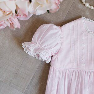 This Strasburg Baby Girl's Heirloom Daygown is an INCREDIBLE RARE FIND! The gown is done in a sweet Pink and is made of 100% Cotton. The neckline is rounded and trimmed in a petite white cotton crocheted lace. The bodice has pintucks with three vertical White floral embroidered vines. The short puff sleeves gather with elastic, leaving a ruffle hem that is trimmed in a matching White crocheted lace. A matching piping joins the gathers of the gown with the bodice. The bottom of the gown has several matching pintucks. The hem gathers with elastic and a finished band hem. A sweet White satin ribbon bow gives the illusion of a drawstring hem, The back has a yoke with an upper button closure done is white pearlized buttons. Perfect for Coming Home outfit or first portraits! Gorgeous RARE little Strasburg Heirloom Piece!! NEW