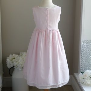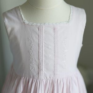 This Precious Strasburg Girls 100% cotton pink sundress has perfect detailing. The squared neckline and arm openings are trimmed with a delicate white cotton lace. The bodice has small French tucks and a white floral vine embroidery. Dress is fully lined and has a double layer hem (beautiful), both layers trimmed in a delicate white cotton lace matching the lace at the neckline. Button back. Strasburg's generous sizing allows for room to grow. Great for summer vacations, portraits, church or just a classy little dress for a day out with mom. Brand new-tags removed and hand washed, flat dry. NWOT! Perfect condition.