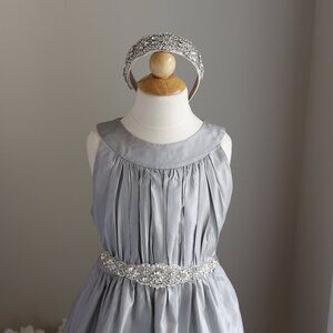 This Strasburg Silver Taffeta girl's formal dress is lovely. A rounded neckline has that continue to the waist where the gathers are finished off with a matching silver piping. A wide satin sash ties into a bow and can be worn in front or back of the dress to change the look. The dress is versatile in that you can change the color of the sash to go according to the season. Deep rich jewel tones for winter or pastel shades for spring. A rhinestone sash and matching headband make wonderful accessories for this dress (NOT AVAILABLE WITH LISTING)-message if interested. Dress is lined with a white cotton slip. Even the slip has detail-a small tier of tulle and a satin ribbon band. Upper button back closure. Gorgeous little flower girl dress for weddings-match the sash to the bridal party. Great for Daddy/Daughter Dances, parties or any special occasion. Perfect Condition-Like New