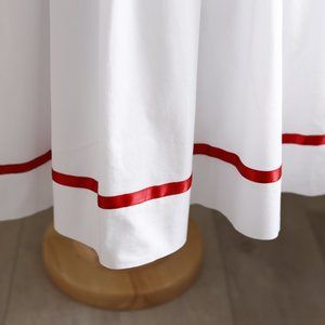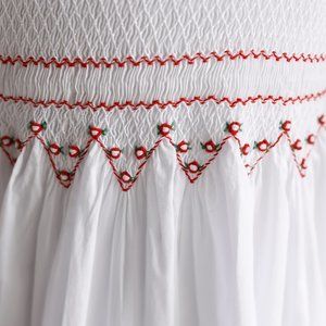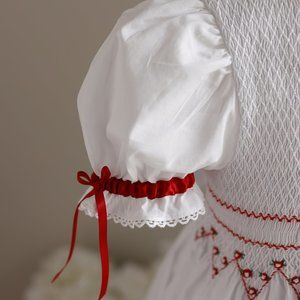 This Strasburg Smocked Heirloom White Dress w/ Red Trim is a classic! One of the ORIGINAL Strasburg's most popular designs, this sweet dress has lots of detail. The bodice is fully smocked with a small lattice design with a red horizontal band accent with accordion smocking just above the waist, followed by the same lattice detail. It is finished off with lovely red and white hand-embroidered rosettes with green leaves in a red embroidered Chevron pattern. The puff sleeves gather with a red satin ribbon trim that ties into bows. So sweet and feminine!!! The skirt has a matching red satin ribbon near the hem. The dress is fully lined with a built-in slip. The back has an upper button closure done in fabric covered buttons (a high-end feature). A tie-back sash completes the look and allows for a perfect fit. Perfect for portraits, church, vacation, weddings or any Special Occasion!! Add a red Sweater and your girl is set to go during cooler months. This dress was worn once for a portrait- so practically still in new condition. Strasburg Heirloom quality which holds its value!! Timeless and CLASSY! Like New-Perfect!!