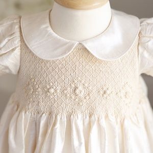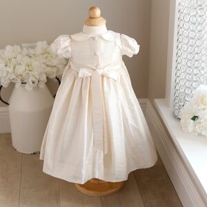 This Smocked Ivory Dress is Exquisite! One of Strasburg's original Dupioni Silk Dresses.The Dress is a beautiful Creamy/ivory Hue. The natural texture of the silk is gorgeous.The Peter Pan collar has a matching silk piping. Entire bodice is smocked with a lattice design embroidery done in a matching ivory/cream hue. 3D embroidery sits atop the smocking and lattice work. Lovely diamond shapes are outlined with French bullion rosebuds with full bullion flowers centered in each diamond. Smaller diamond shapes sit between the larger ones and are done in bullion rosebud stitching and having a rose bullion in the center of each. The beautiful skirt gathers at the bottom of the smocking and each side has two vertical rows of 3- double stitched pintucks (a sweet extra element). The short puff sleeves gather with a matching 1/2" silk band. The back has a yoke with a button closure done in matching silk fabric covered buttons(a high-end detail). \A matching tie-back sash makes for the perfect fit. The dress is fully lined except for the sleeves. A double layer of lining at the bottom adds the perfect amount of volume.The perfect length for a formal baby dress without the fuss of a longer gown.Great for Weddings, Portraits or other Special Occasions. Gorgeous and no longer in production-GREAT FIND!! Gently used once- Stunning!!