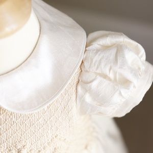 This Smocked Ivory Dress is Exquisite! One of Strasburg's original Dupioni Silk Dresses.The Dress is a beautiful Creamy/ivory Hue. The natural texture of the silk is gorgeous.The Peter Pan collar has a matching silk piping. Entire bodice is smocked with a lattice design embroidery done in a matching ivory/cream hue. 3D embroidery sits atop the smocking and lattice work. Lovely diamond shapes are outlined with French bullion rosebuds with full bullion flowers centered in each diamond. Smaller diamond shapes sit between the larger ones and are done in bullion rosebud stitching and having a rose bullion in the center of each. The beautiful skirt gathers at the bottom of the smocking and each side has two vertical rows of 3- double stitched pintucks (a sweet extra element). The short puff sleeves gather with a matching 1/2" silk band. The back has a yoke with a button closure done in matching silk fabric covered buttons(a high-end detail). \A matching tie-back sash makes for the perfect fit. The dress is fully lined except for the sleeves. A double layer of lining at the bottom adds the perfect amount of volume.The perfect length for a formal baby dress without the fuss of a longer gown.Great for Weddings, Portraits or other Special Occasions. Gorgeous and no longer in production-GREAT FIND!! Gently used once- Stunning!!