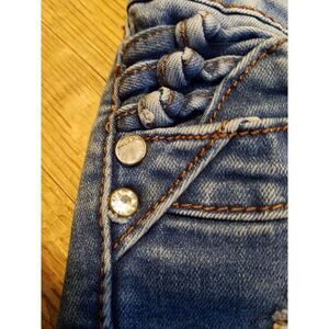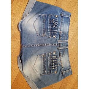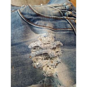 Strass distressed denim shorts Jr size 11. Denim destressed shorts with rhinestone accents. Measures 32 waist, 2.5 inseam, 8 rise.