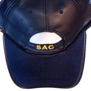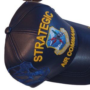 Blue 6 panel polyurethane hat with "Strategic Air Command" in gold embroidery and the SAC insignia on the crown. The right side of the crown has the SAC insignia in blue embroidery. The left edge of the brim has "SAC" in gold embroidery. The back of the hat has "SAC" in gold embroidery on an adjustable velcro tab closure. One size fits most adults.