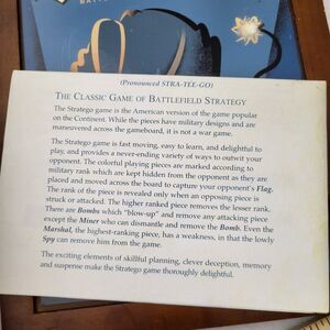 The set includes a book that serves as a comprehensive guide to the game, providing players with all the necessary information to make strategic decisions. The box also features a unique design that adds an aesthetic touch to any game collection. Get your hands on this rare find and relive the excitement of playing Stratego with your friends and family.