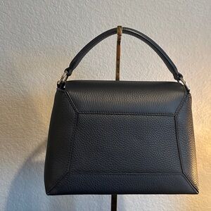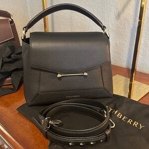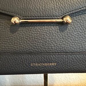 Chic Strathberry satchel in black leather. Features a structured design with a top handle and gold-tone hardware. Shoulder/crossbody strap and dust bag included