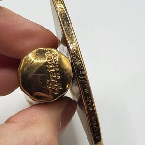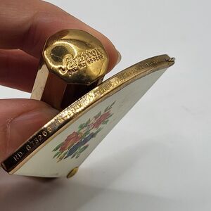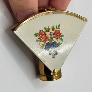 Stratton 1950s Fan Shaped Lipstick Holder, Floral Cover, Handbag Mirror, Vintage | Materials: gold metal alloy, enamel, mirror | Length: 2.25in long2.5in wide | Clasp: lipstick tube | Signed? Stratton Made in England | Excellent vintage condition