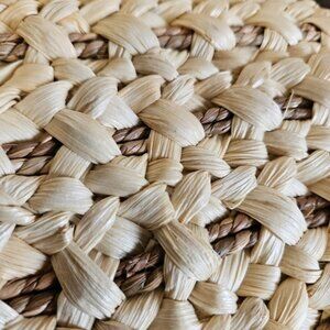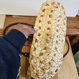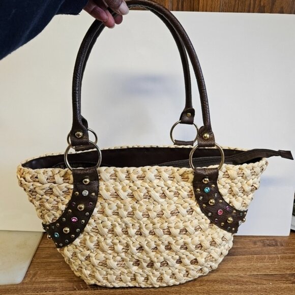 "Straw Basket Weave with Rhinestones Tote Bag. Lined interior. Zippered top closure. Double top handles. Large. Rhinestones on trim. Nice carry-all.