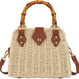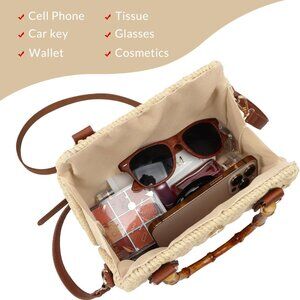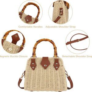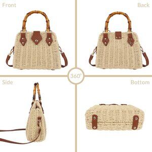 Features: This high-quality paper straw bag features a unique trapezoidal silhouette, sturdy bamboo handle, gold-tone hardware, and a magnetic closure. Handwoven for durability, it can be carried as a crossbody, shoulder bag, or chic handbag, making it versatile for any outfit.