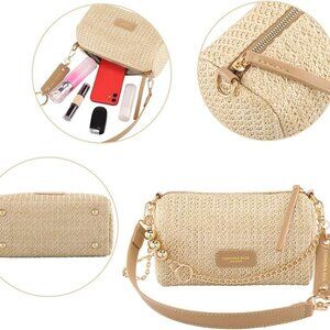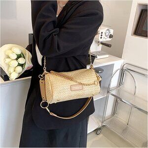 Features: Stylish woven cylindrical beach bag with a spacious interior to hold all your essentials. Comes with three removable straps — a chic gold-tone chain for crossbody wear, a casual PU leather shoulder strap, and a cute short metal chain — so you can switch up your look easily. Made of high-quality straw, polyester lining, PU leather, and metal accents, it feels soft yet sturdy. The zipper closure keeps your items secure, and the versatile style makes it suitable for beach days, casual outings, or even as a cute date night clutch.