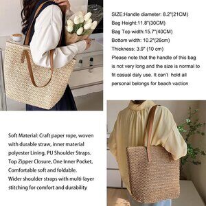 Material: Craft paper rope, woven straw, polyester lining, PU shoulder straps.