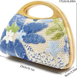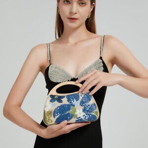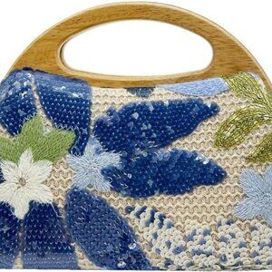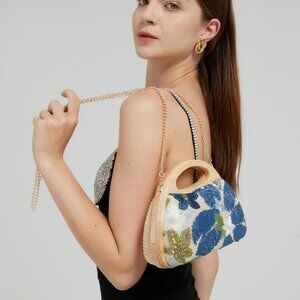 Features: Crafted with high-quality straw and decorated with sparkling sequin embroidered flowers, this mini clutch adds a touch of elegance to any outfit. The magnetic closure ensures easy access while keeping your essentials secure. Features a removable chain strap for versatile styling — wear it as a crossbody or carry it by the top handle.