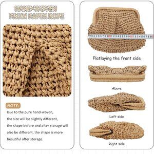 Features: Hand-woven from paper rope with a sleek responsible closure, this clutch combines casual chic with functionality. Its compact size is ideal for carrying essentials like your phone, lip balm, and tissues. The cloud-inspired woven design adds a touch of boho elegance to any outfit.