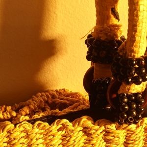 This a great summer fun bag. It's made of real corn husk. There are beautiful black beaded accents all over. The handles are hand stitched in black. The inside is black fabric flowing loosely with 1 zippered compartment. It is 17" from top of handles down or 9.5" from top of bag to bottom x 16" wide. In Excellent new condition.