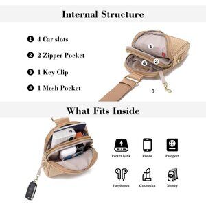 Features: This easy-to-carry sling bag measures about 7.5 inches high, 5 inches long, and 2 inches wide. The adjustable strap (25 to 47 inches) makes it comfy for all-day wear. Perfect for travelers or a chic everyday look—fits your passport, ID, and essentials for busy airport days or city adventures. The secure side lock and four RFID-blocking card slots keep your info safe, while the back D-ring adds extra convenience for attaching keys or accessories. Plus, the built-in keychain keeps your keys just a grab away. Can easily switch between crossbody, sling, chest, or fanny pack styles!