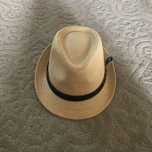 Straw fedora with leather band. Small knick on the brim but not noticeable when wearing!