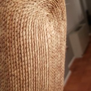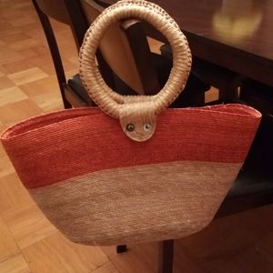 Straw handbag with circle handles. Orange and natural straw colors. Has velcro closures. Very clean inside and out. Measurements in pics.