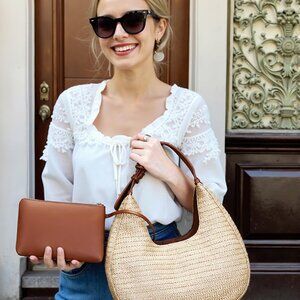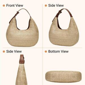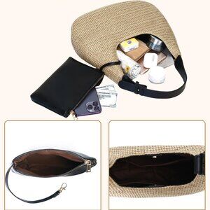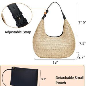 Features: Handwoven natural straw material with vegan faux PU leather accents. Classic pattern with a top magnetic buckle closure to keep your items secure. Comes with an adjustable strap for versatile carrying options—handbag, shoulder purse, satchel, or underarm bag. Spacious main compartment plus inner zipper and slip pockets for all your essentials, like keys, wallet, or sunglasses. Includes a matching pouch for small necessities.