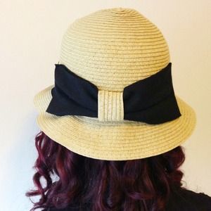 Beige straw hat with round brim all the way around. Black bow at the back.