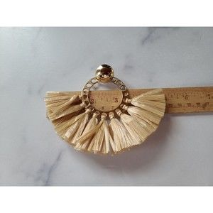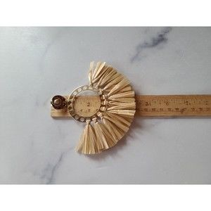These are a pair of large gold tone metal dangling stud hoop earrings with straw fringe.