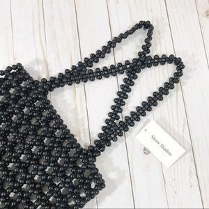 Add texture and versatility to your accessories with this Straw Studios beaded tote. Designed in a sleek black beaded weave, this bag is perfect for the beach, farmers markets, or a night out with an edge.