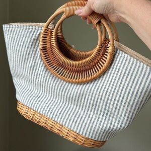 Straw Studios Round Rattan Handle Cotton Bag Basket Base Zip Top Tassel New