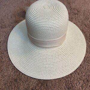 Like new Straw hat sun shade with beige ribbon. Missing tag stating sow, but the weave of the straw should make it UV protective
