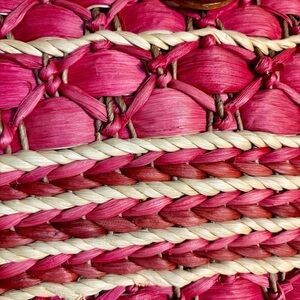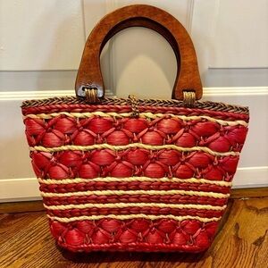 Straw Tote Red Beige Brown 100% Cornhusk Wooden Handles Fabric interior Pocket