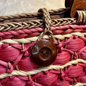 Straw Tote Red Beige Brown 100% Cornhusk Wooden Handles Fabric interior Pocket