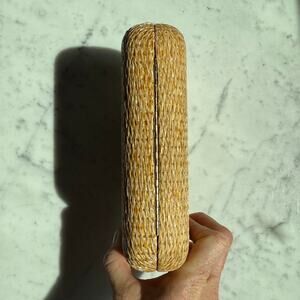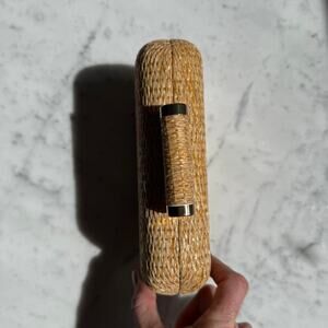 Chic straw woven hard case clutch with a structured box silhouette and sleek gold-tone details. Features a snap-top clasp and detachable chain strap for versatile styling as a crossbody or evening clutch.