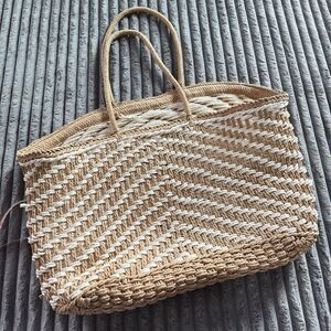 Measuring 22 inches in width, 12 inches in height and 5 inches in depth, this tote has ample space for all your essentials. The woven pattern and matte finish make it a stylish and chic choice for any occasion. The light beige lining and straw material add to its natural and earthy appeal. Whether you're heading to the beach or running errands, this tote is the perfect addition to your wardrobe.