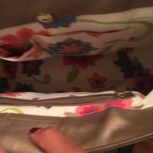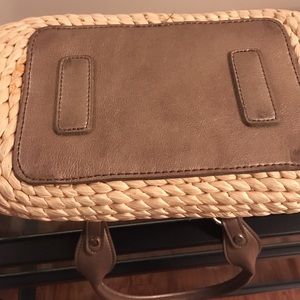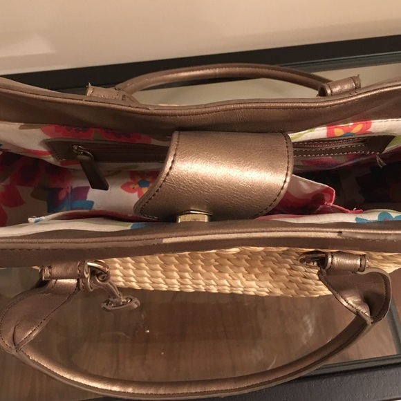 Straw bag inGREAT SHAPE! Can be used as a purse or beach bag for 1! Floral lining with zipper pocket and two side pockets on inside of bag. Trim is metallic bronze leather.