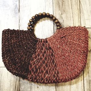 Pretty and unique straw/grass bag with wooden beaded handles in brown and the straw/grass purse in coral and brown. Lined in dark brown fabric. Looks stunning with distressed jeans, brown leather booties, a pretty silky blouse layered under a casual wool or canvas jacket. Not perfect condition, but in very good useable shape. The beads show wear, and the "grass" shows light wear as well.