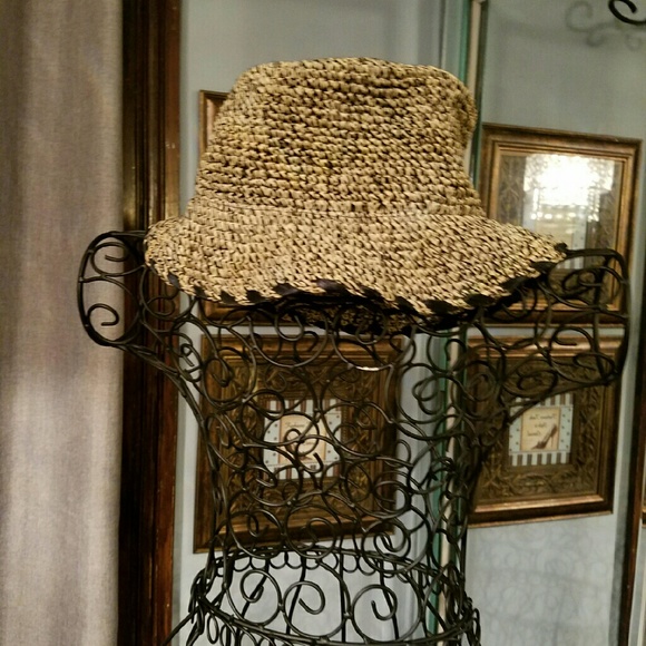 Medium tan straw hat with a black details throughout black ribbon woven around the edge