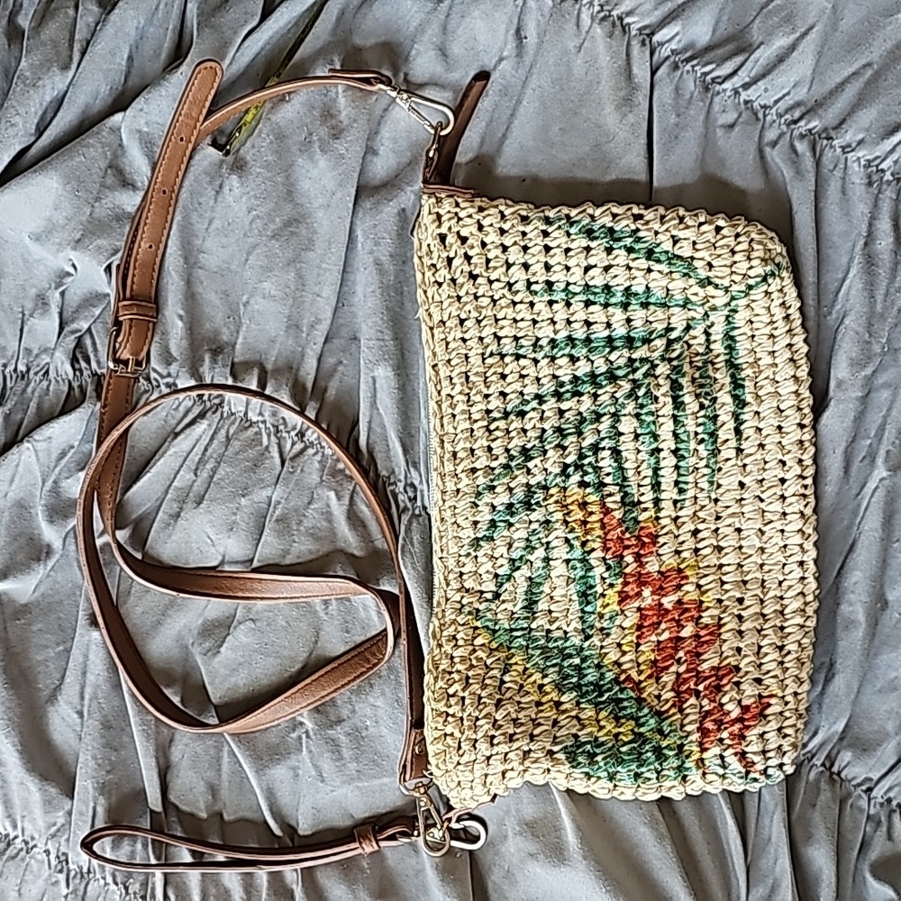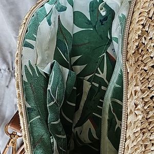 Straw Purse with Palm tree design on front and Palm tree lining. Purse has 2 options for wearing and includes wristlet or long crossbody strap. Inside has 1 zipper pocket and 2 small pockets. Inside of bag has some ink pen marks. Outside of bag is in great condition.