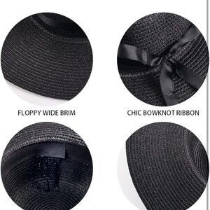 NWT Foldable large brim adjustable black straw sun hat with a bow. Adjustable elastic tie inside. Iron to flatten.