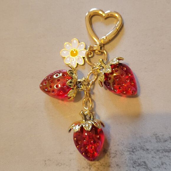 Strawberries and Enamel Daisy Keychain Bag Charm, approximately 4" in length.